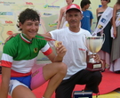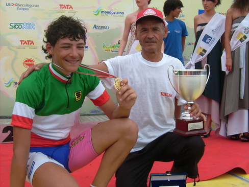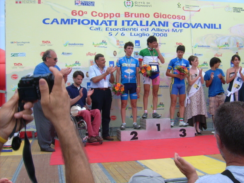 | Nel Campionato Italiano Allievi il toscano Bonistalli Francesco (UC Empolese) conquista la maglia tricolore - LA CRONACA IN DIRETTA - 11:30: Partenza: I 141 iscritti si stanno dirigendo al chilometro zero per il via ufficiale in rappresentanza delle 20 regioni Italiane oltre ad un atleta del V.C.Lugano 11:40: Via Ufficiale alle ore 11.38 per percorrere i Km.81,00 11:50: Al chilometro sei di gara gruppo compatto 11:55: Primo tentativo a cura di Andrea Toniatti del Comitato Regionale di Trento che viene raggiunto da Spangaro del Veneto e Scipione dell'Abruzzo a cui si aggiunge De Facentis della Puglia 12:05: Aumenta a 41 secondi il vantaggio dei quattro al Km.16 12:10: Al Km.22 i quattro di testa hanno 45 secondi di vantaggio sul gruppo. 12:20: I quattro di testa sono raggiunti gruppo compatto al Km.27 12:30: Al Km.33 tentativo di sei corridori Sogne,Todaro,Vanelli,Berlato,Venturini,Severa vantaggio 13 secondi 12:37: Al Km.40.500 meta' gara gruppo compatto 12:38: Dopo un'ora di corsa media oraria Km.42 12:45: Tentativo di fuga del Campione Lombardo Alessandro Tonelli a 6 secondi il ligure Cappelli il gruppo a 29 secondi 12:47: Quando si affronta per la terza volta la salita di San Grato Alessandro Tonelli e Luca Cappelli al comando con ventuno secondi su quattro atleti il gruppo a 34 secondi 12:50: Giacomo Berlato si aggancia ai due di testa , ma il gruppo e' a poche decine di metri dai tre di testa 12:53: Gruppo compatto al chilometro 50 , gruppo che comunque si sta dividendo in due tronconi 12:56: Appena ripresi scattano nuovamente Alessandro Tonelli e Luca Cappelli assieme a Mauro Marcassoli ed al Campione Toscano Francesco Bonistalli vantaggio sul gruppo 21 secondi 13:00: Quando inzia l'ultimo giro il vantaggio dei quattro ammonta a 26 secondi 13:05: Al chilometro 57 il vantaggio aumenta a 32 secondi 13:08: Al chilometro sessanta il vantaggio e' sempre di 32 secondi 13:10: Alle spalle dei quattro esce il lombardo Matteo Fontana il gruppo a 45 secondi 13:12: Quando mancano quindici chilometri all'arrivo il distacco del gruppo sale a 1.02 13:15: A tredici chilometri dall'arrivo quattro al comando , Matteo Fontana a 35 secondi gruppo a 56 secondi 13:18: A dieci chilometri dall'arrivo parecchi tentativi di evasione dal gruppo nel tentativo di raggiungere i quattro di testa ma distacco per il momento quasi invariato. 13:20: Si inizia per l'ultima volta la salita di San Grato con i distacchi invariati. 13:22: Alle spalle dei quattro grande reazione del gruppo che ha 33 secondi di distacco 13:24: A 8 chilometri dall'arrivo gruppo a 18 secondi 13:25: A 7 chilometri dall'arrivo vantaggio 17 secondi 13:28: A 4 chilometri dall'arrivo alle spalle dei quattro si avvicinano Stefano Verona e Andrea Toniatti che hanno cinque secondi gruppo a diciotto secondi 13:30: A 3 dall'arrivo sei al comando gruppo a 24 secondi i sei sono Verona,Bonistalli,Tonelli,Marcassoli,Toniatti e Cappelli. 13:32: All'ultimo chilometro sei al comando gruppo in rimonta. 13:34: Francesco Bonistalli e' il nuovo Campione Italiano . Vince allo sprint dopo il Campionato Toscano anche quello Italiano. 13:36: Alle spalle di Bonistalli secondo Mauro Marcassoli terzo Andrea Toniatti. |